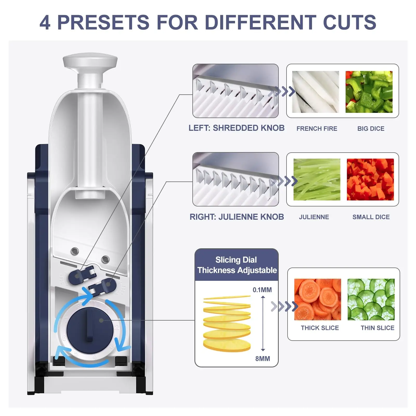Multifuncional: O cortador de vegetais oferece 4 opções de modo: juliana, matchstick, fatiar e cortar dados, tudo feito de uma só vez, sem necessidade de trocar as lâminas.Espessura ajustável 0,1-8mm, perfeita para fatiar rapidamente batatas, cenouras, pepinos, cebolas...